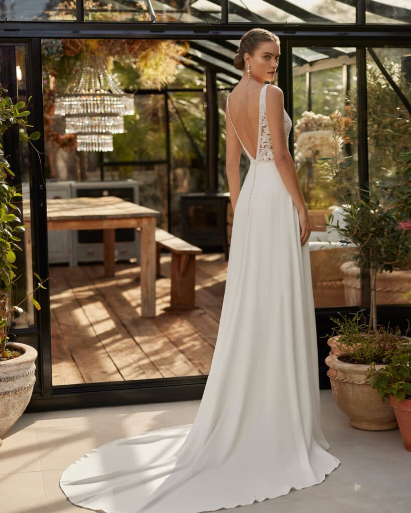 La coupe fluide d’Ula convient à de nombreuses morphologies, en valorisant la taille sans la marquer excessivement et en laissant la jupe s’épanouir librement. Le choix du crêpe garantit un tombé doux, un confort optimal et une grande liberté de mouvement — atouts précieux pour marcher, danser ou vivre pleinement chaque moment du jour J. Ula est idéale pour la mariée qui souhaite une robe élégante, discrète, facile à porter, tout en conservant un style chic et contemporain — parfaitement compatible avec l’expérience personnalisée de Robe Elysée.